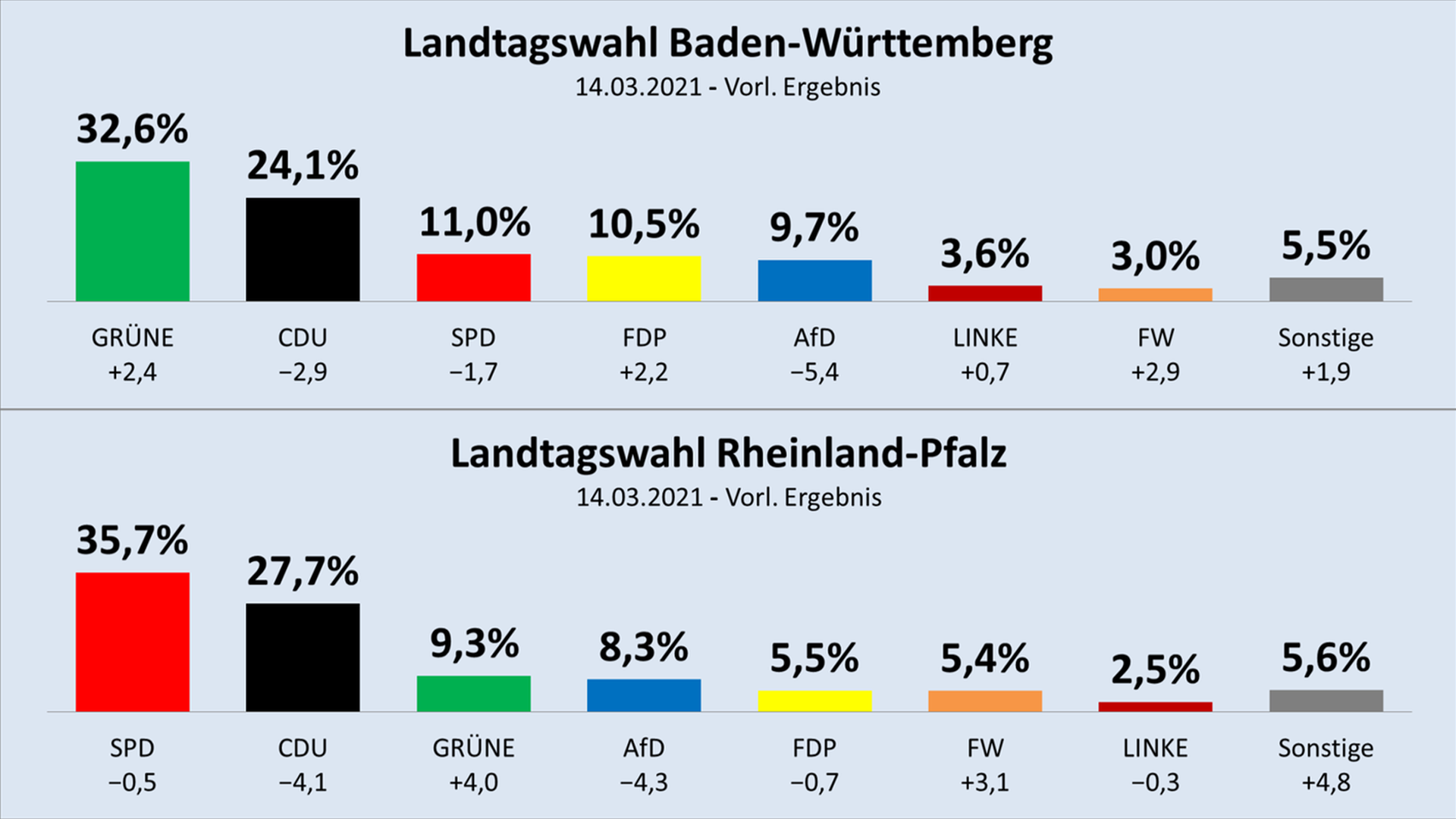 In Baden-Württemberg triumphiert Winfried Kretschmann (Grüne), in Rheinland-Pfalz Malu Dreyer (SPD). Die CDU fällt dagegen in beiden Landtagswahlen in bislang unvorstellbare Bereiche. Der größte Wahlverlierer ist aber zweimal die AfD, die 35 von 100 ihrer Wähler verliert, in absoluten Zahlen wegen der geringeren Wahlbeteiligung sogar über 40. Die Linke bleibt im Niemandsland, die FDP durchwachsen. Einen Überraschungserfolg erzielen dagegen die Freien Wähler.