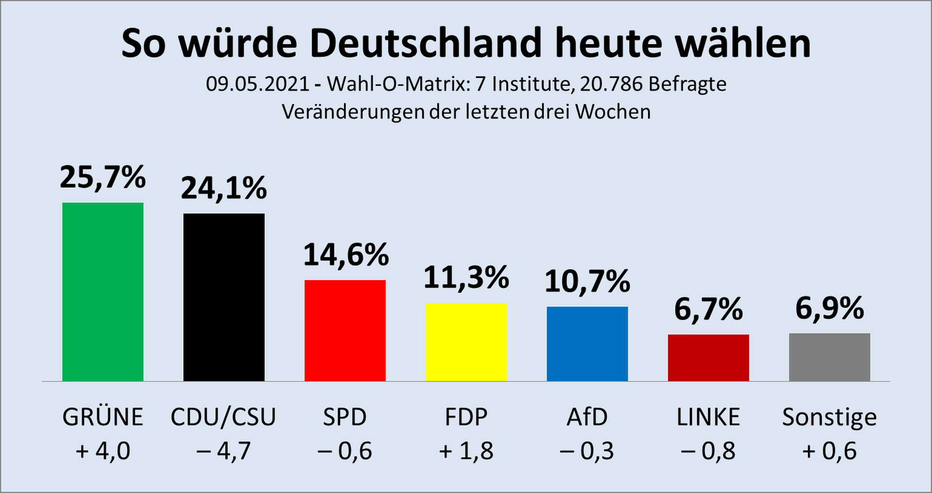 Vor knapp drei Wochen wurden Annalena Baerbock und Armin Laschet zu Kanzlerkandidaten nominiert. Seither haben sich die Umfragewerte der Grünen und der Union deutlich verändert, wobei die Unterschiede in den letzten sieben Tage etwas zurückgingen. Eine andere Partei befindet sich aber in einer Abwärtsbewegung und erreicht im Wahl-O-Matrix-Mittel aller Institute mit den niedrigsten Wert seit vielen Jahren: DIE LINKE.