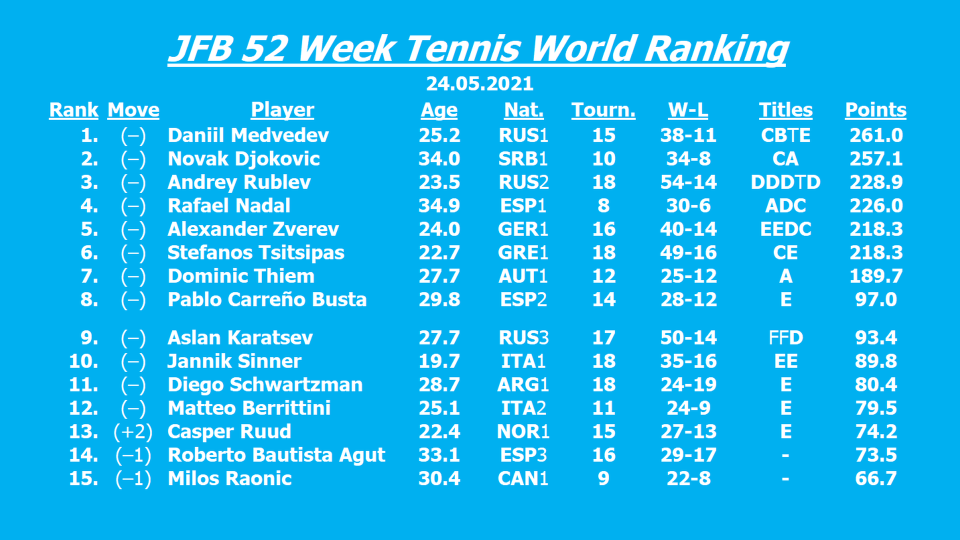 Novak Djokovic, who was disqualified at the US Open (A), who did not compete in Paris-Bercy (C), Rotterdam (D), Dubai or Acapulco (D), Miami (C) and Madrid (C), who was eliminated early in Monte Carlo (C) and Serbia Open (E) and could not defend his title in Rome (C), had dropped from 1 to 2 in the 52-week ranking. He will compete in the Belgrade Open (E) this week (23.05. to 29.05.2021), which has a very weak field (no other top 30 player competing). Should he reach the final in this tournament, for which he would then receive 6 points, he will overtake Daniil Medvedev and be the world No. 1 again in the JFB 52 Week Ranking.