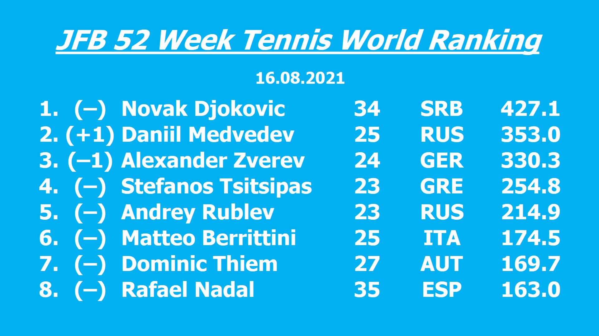 The JFB 52 Week Tennis World Rankings as of 16 Aug 2021