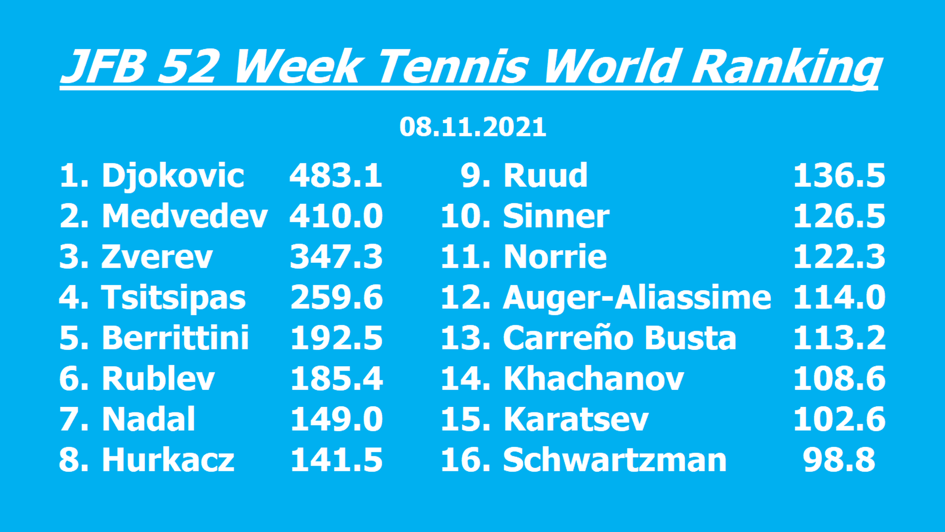 Mit seinem Sieg beim Paris Masters 1000 setzt sich Novak Djokovic im JFB 52 Week Tennis World Ranking weiter von Daniil Medvedev ab, der seinen Titel nicht verteidigen konnte. Paris-Halbfinalist Hubert Hurkacz schiebt sich auf 8 nach vorne, der 18-jährige Carlos Alcaraz ist erstmals in den Top 20 und Viertelfinalist Taylor Fritz ist die neue US Nr. 1.