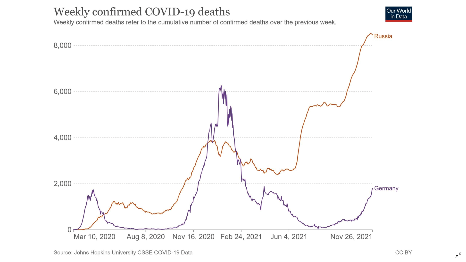 In Deutschland steigt die Zahl der COVID-19-Todesfälle erstmals seit April wieder Richtung 2.000 pro Woche. Die 2.000er Marke wurde bisher nur einmal überschritten, von Ende November 2020 bis Anfang März 2021. Russland zählt inzwischen 8.500 Todesfälle pro Woche. Offiziell.