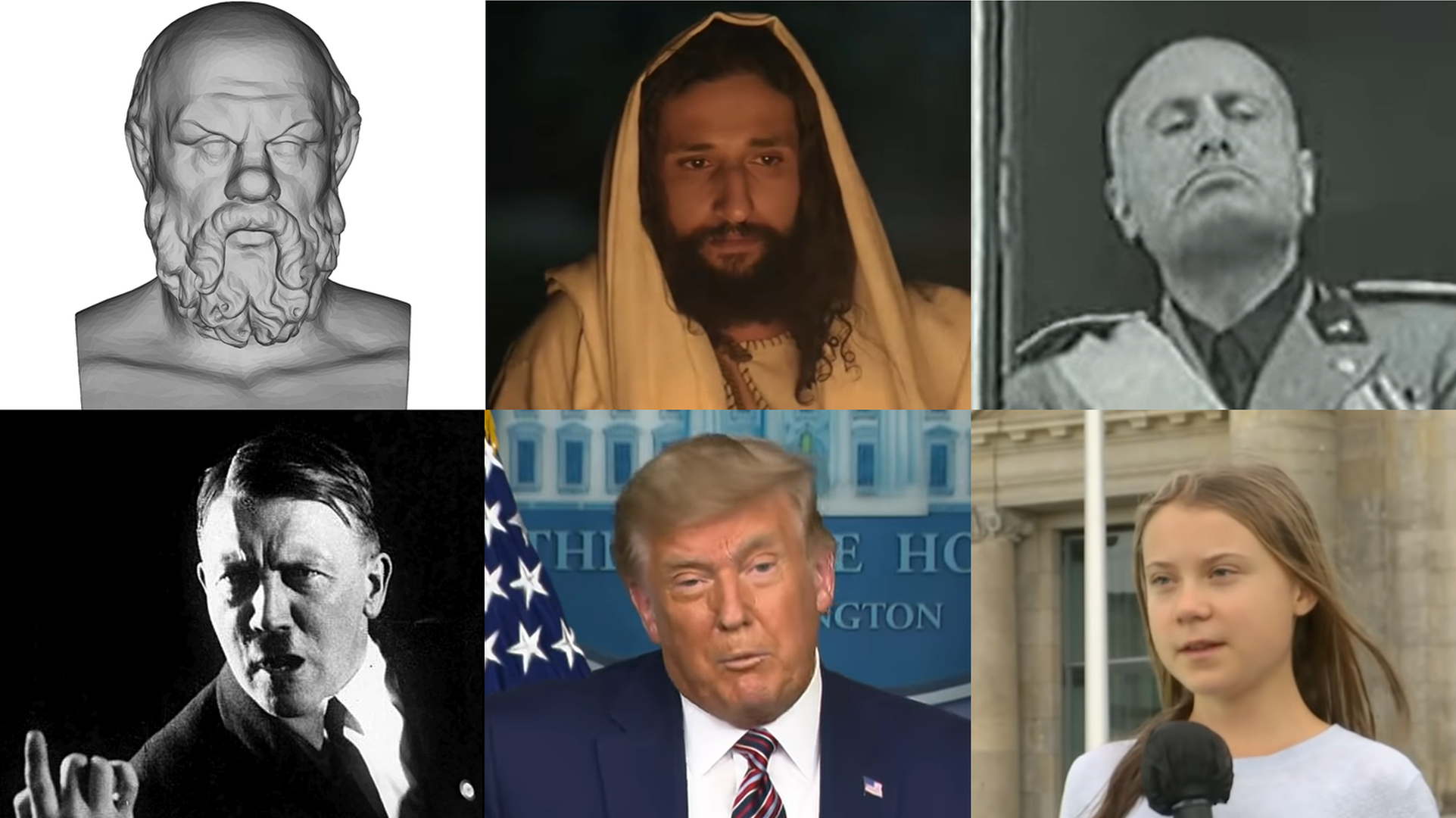 Titelbild: Sokrates, Gordon Johnson, Pixabay, CC0 Creative Commons, Jesus von Nazareth, ZDF-Screenshot, Benito Mussolini, canale7-Screenshot, Adolf Hitler, Bundesarchiv, Bild 102-13774 / Unknown Heinrich Hoffmann / CC-BY-SA 3.0, CC BY-SA 3.0 DE <https://creativecommons.org/licenses/by-sa/3.0/de/deed.en>, via Wikimedia Commons, Donald Trump, YouTube-Screenshot, Greta Thunberg, WELT-Screenshot
