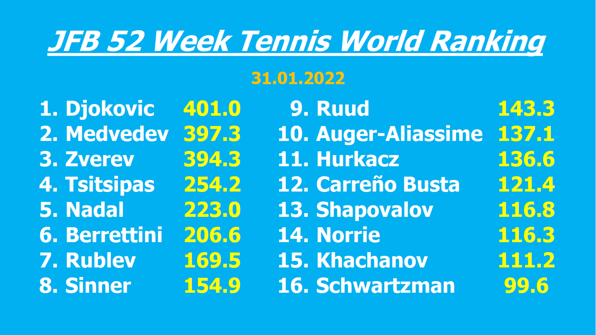 As Novak Djokovic was denied entry to Australia due to his lack of vaccination against COVID-19, the Serb was unable to defend his Australian Open title and thus loses 100 points in the JFB 52 Week Tennis World Ranking, falling from 501.0 to 401.0. Alexander Zverev would have only needed to reach the quarter-finals again to overtake Djokovic (20 points). However, the German was surprisingly eliminated in the round of 16 against Denis Shapovalov and thus loses 10 points.