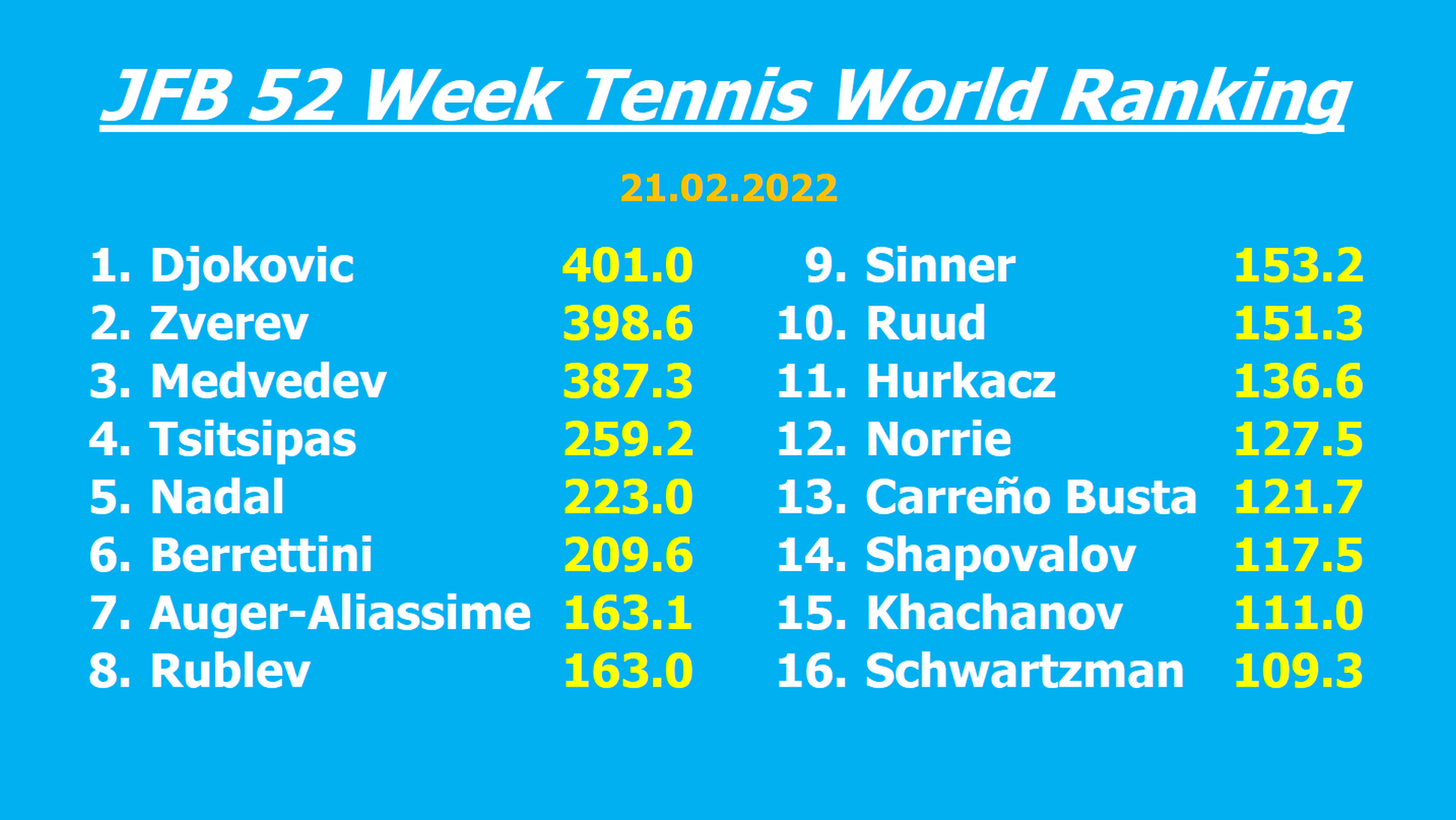 Daniil Medvedev lost 10 points for not playing in Marseille (E), where he won the tournament last year. He now has „only“ four tournament wins in the last 52 weeks (Zverev and Ruud 6, Djokovic, Medvedev and Nadal 4, with Ruud’s 6 titles all coming in lower-ranked E tournaments).