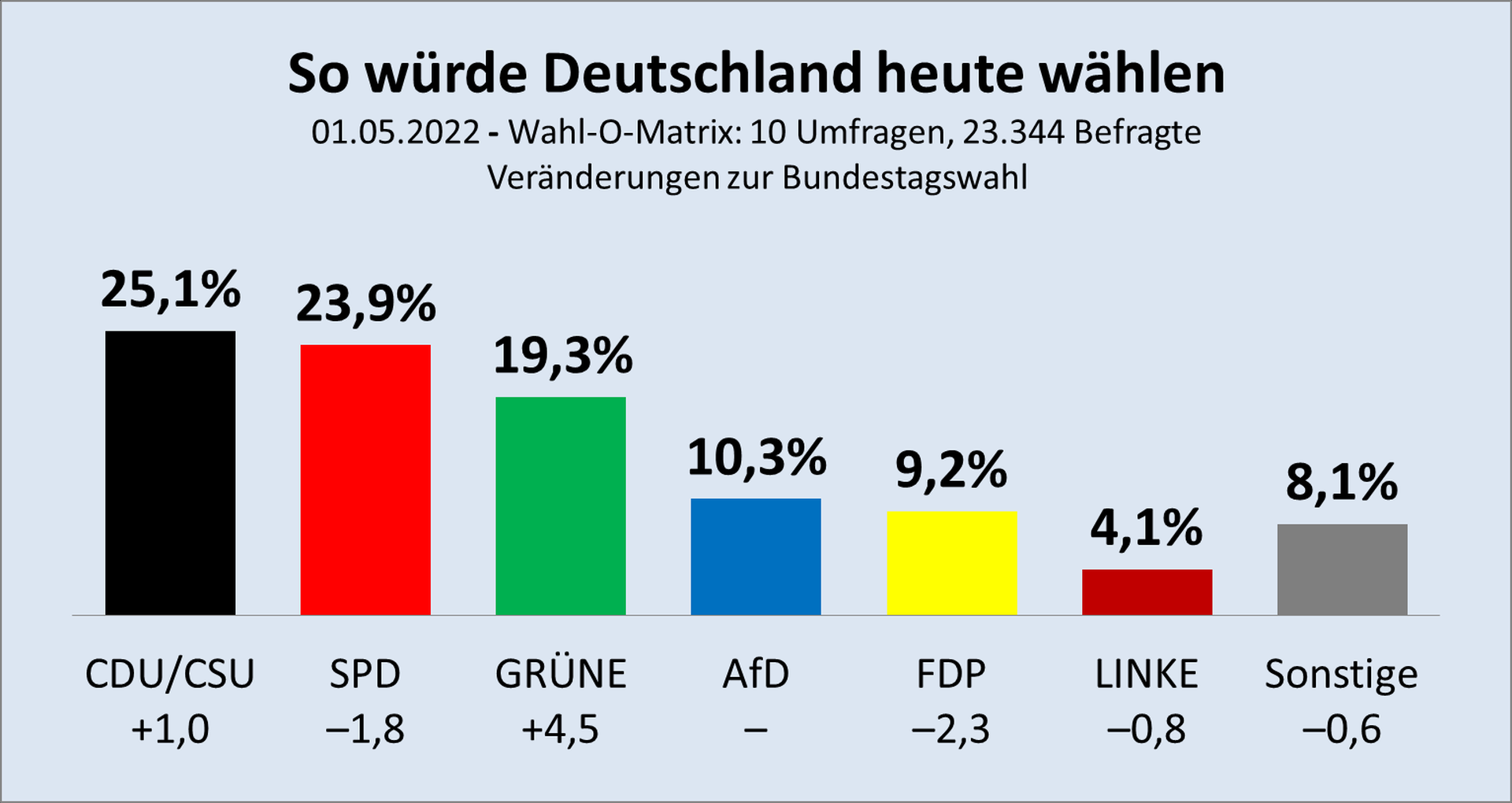 Der große Gewinner der letzten Monate sind damit eindeutig Die Grünen, die insbesondere von der Arbeit ihrer beiden wichtigsten Bundesminister, Robert Habeck, Wirtschaftsminister und Vizekanzler, sowie Annalena Baerbock, Außenministerin, profitieren. Zulegen können auch CDU/CSU. Der Wechsel an der Parteispitze der CDU und der Spitze der Bundestagsfraktion mit Friedrich Merz als dem neuen Gesicht von CDU und Union scheint bisher zwar noch nicht voll durchzuschlagen, aber insgesamt doch zu gelingen.