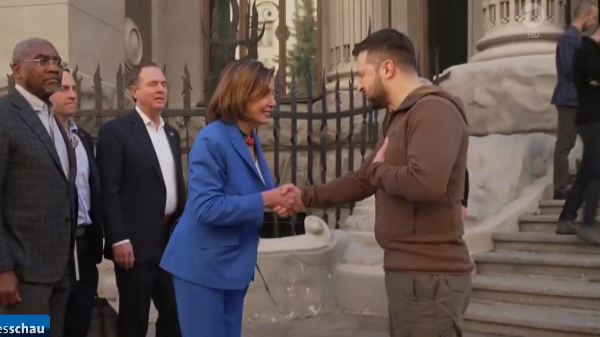 Die Vorsitzende des US-Repräsentantenhauses Nancy Pelosi hat am Samstag, ohne das vorab bekannt zu geben, Kiew besucht und dort den ukrainischen Präsidenten Wolodymyr Selenskyj getroffen. Ein Sprecher Pelosis teilte mit: „Unsere Delegation ist nach Kiew gereist, um eine unmissverständliche und schallende Botschaft an die ganze Welt zu senden: Amerika steht fest an der Seite der Ukraine.“