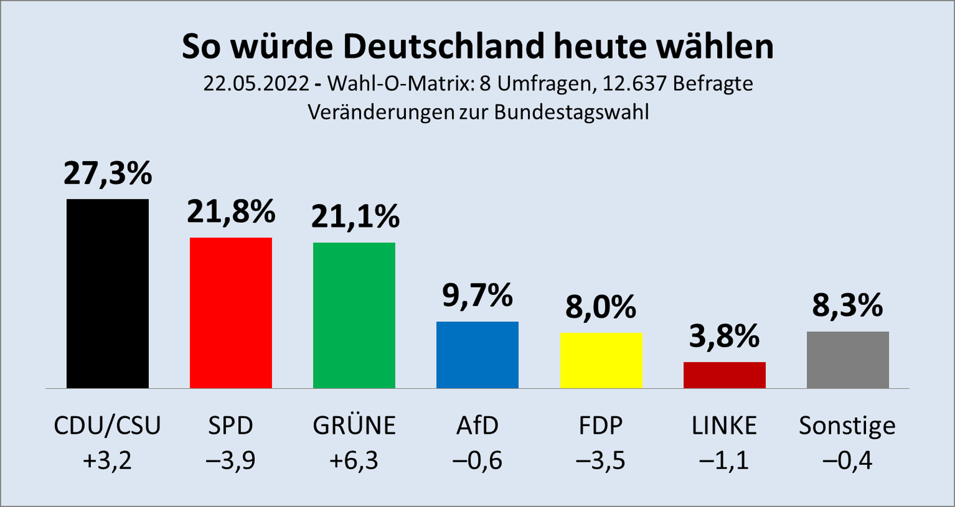 Bei der Bundestagswahl am 26.09.2021 kam die SPD auf 25,7 Prozent, lag damit 1,6 Punkte vor der Union auf Platz eins. Kurz nach der Wahl konnte sie im Wahl-O-Matrix-Mittel aller Institute sogar auf 28 Prozent steigen, während CDU/CSU im Oktober sogar bis auf 19 Prozent fiel. Seit Mitte Dezember war dann klar, dass Friedrich Merz den CDU-Bundesvorsitz von dem doch sehr enttäuschenden Armin Laschet übernehmen wird. Inzwischen ist die Union erstmals seit der Wahl wieder über 27 Prozent und liegt damit nun fünf bis sechs Punkte vor der SPD klar auf Platz eins.