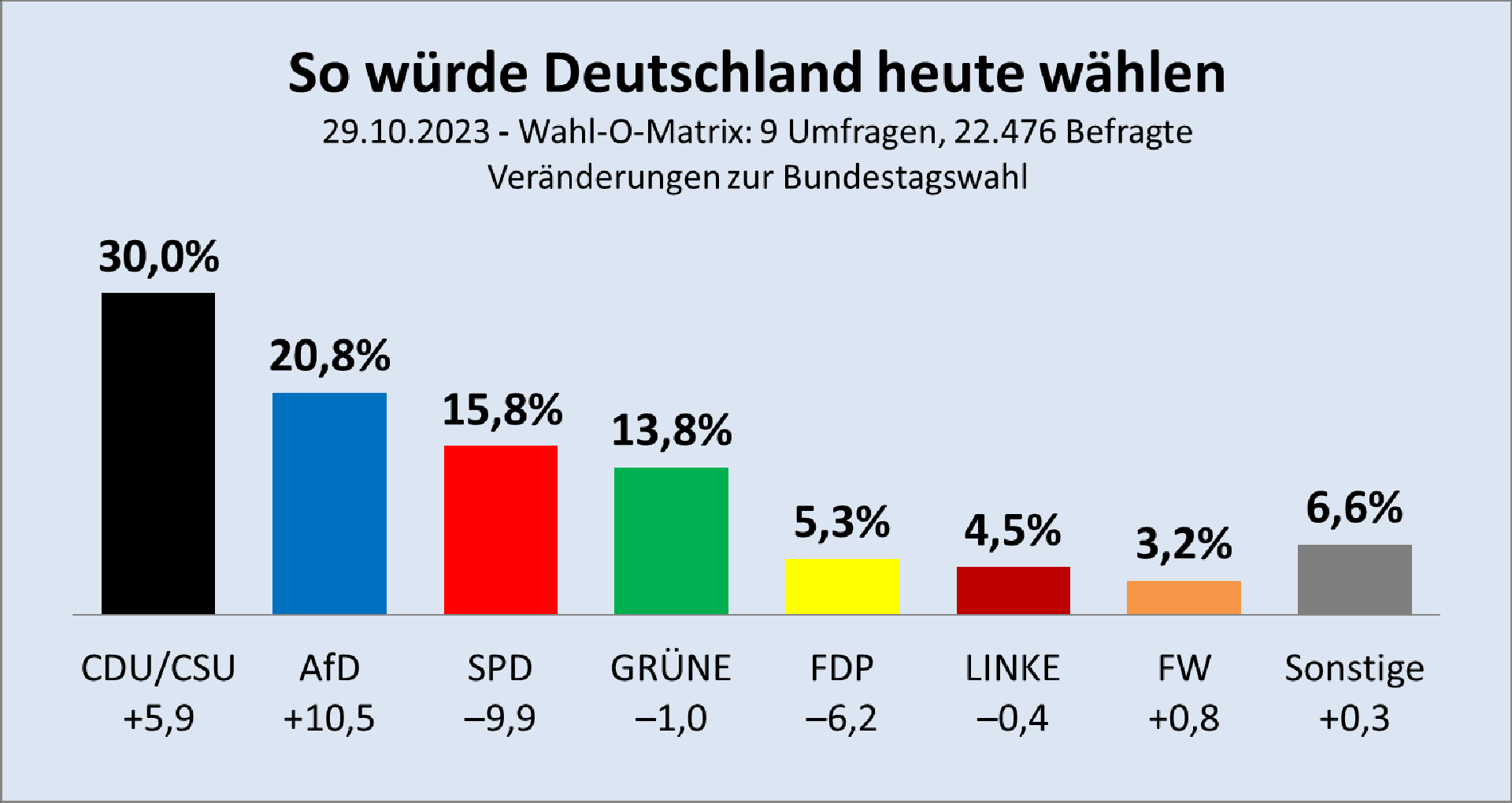 Am meisten zulegen konnte seit der Wahl die AfD, die von 10,3 auf ca. 20,8 Prozent, also um mehr als 10 Punkte steigt. Klarer Wahlsieger wären heute CDU/CSU, die auf ca. 30 Prozent käme und damit stärker wäre als SPD und Grüne zusammen. Die Linke und die Freien Wähler lägen derzeit beide unter 5 Prozent. Die Partei, die Sahra Wagenknecht im Januar 2024 gründen möchte (Bündnis Sahra Wagenknecht BSW) ist hier noch nicht berücksichtigt, weil diese im Moment ja noch nicht existiert, mithin nicht gewählt werden könnte. Wie BSW die Parteienlandschaft verändern wird, wird man nächstes Jahr sehen müssen. Vor allem die AfD und Die Linke, aber auch die anderen Parteien könnten dann Stimmen an die BSW verlieren.