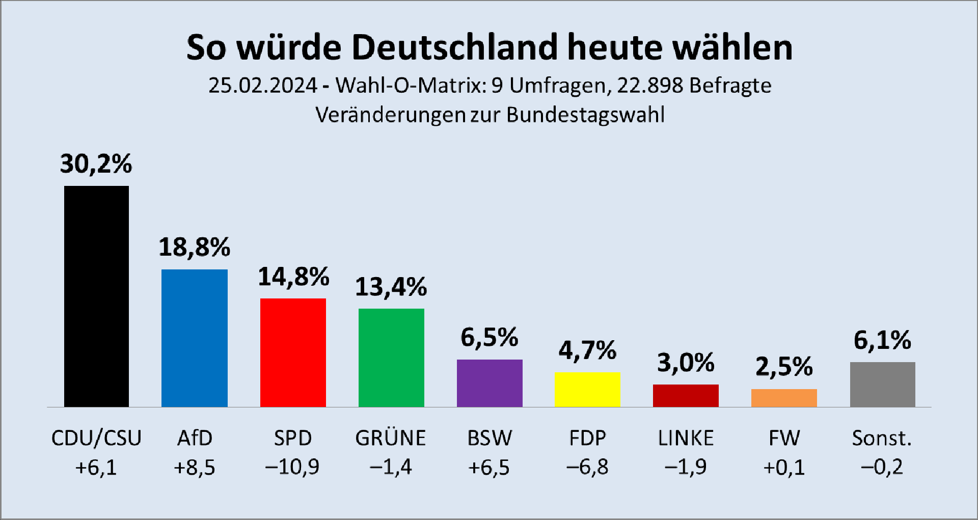 29 Monate nach der Bundestagswahl würde nicht einmal jeder Dritte eine der drei Ampelparteien wählen. Die FDP verliert seither 6 von 10 ihrer Anhänger, die SPD mehr als 4 von 10. Die AfD verliert seit Anfang Januar 4 Punkte. BSW hätte mit ca. 6,5 Prozent sehr gute Chancen, direkt in den Bundestag einzuziehen, LINKE und Freie Wähler hätten kaum Chancen. Klare Nr. 1 bleibt die Union.