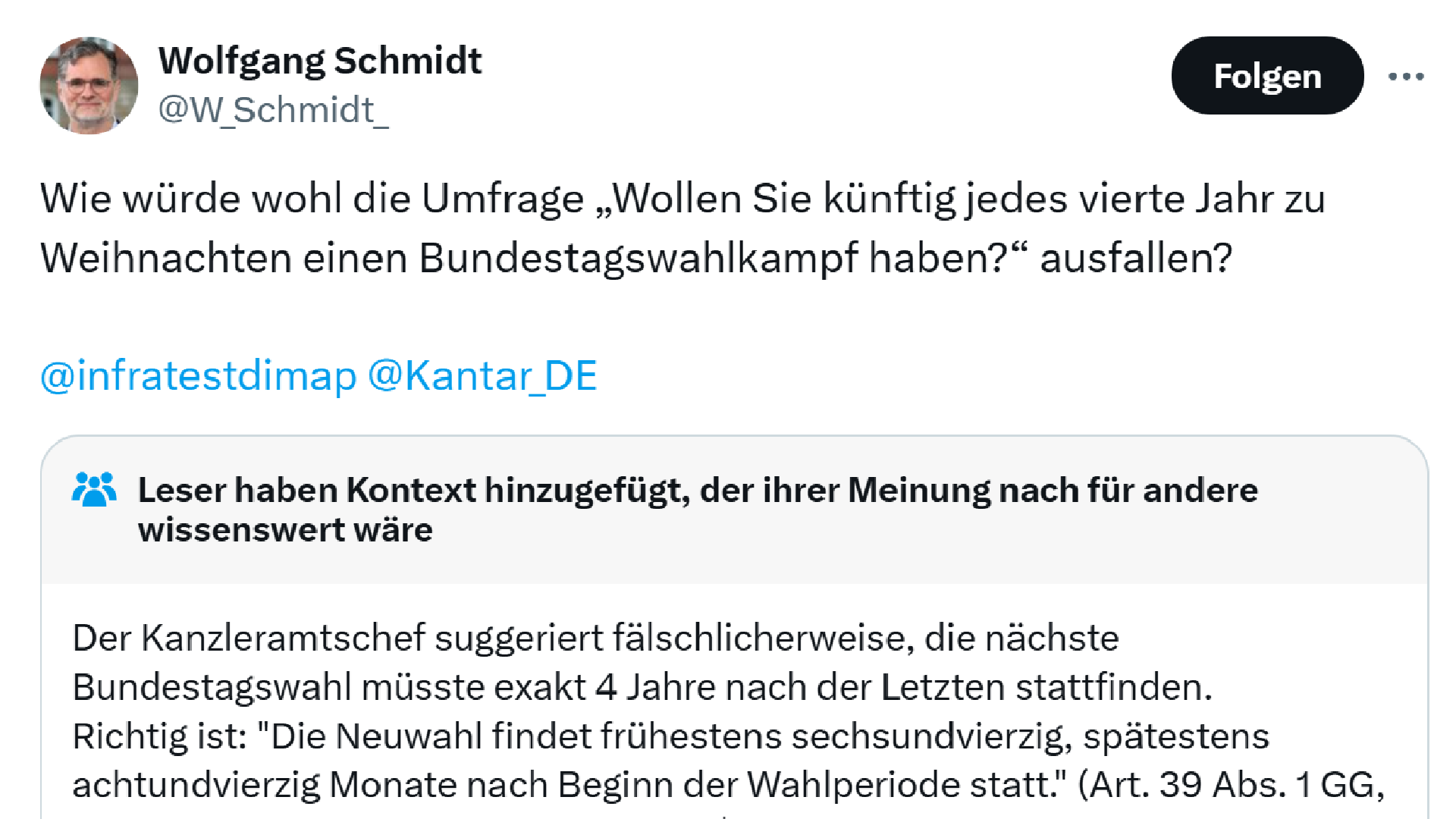 »Es ist absolut beschämend, was für ein Demagoge der Kanzleramtschef Wolfgang Schmidt hier ist. Entweder will er die Wähler absichtlich für dumm verkaufen oder er zeigt eine Unkenntnis des GG, die es in seiner Position nicht geben darf. Aber bei diesem Kanzleramt wundert einen nichts mehr. Denn: Es kann laut Grundgesetz bereits nach 46 Monaten regulär wiedergewählt werden (max. 48). Man kann also innerhalb der Fristen den Wahltermin Stück für Stück wieder auf Herbst schieben. So geschehen nach der Wahl im März 1983. 1994 war es dann wieder Oktober.«