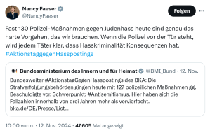 Faeser verkauft der Bevölkerung diese Hausdurchsuchung unter der Überschrift „Polizei-Maßnahmen gegen Judenhass“