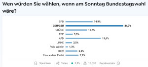 - AfD: 17 – 19,4 % ==> 18,5 % (+8,2)