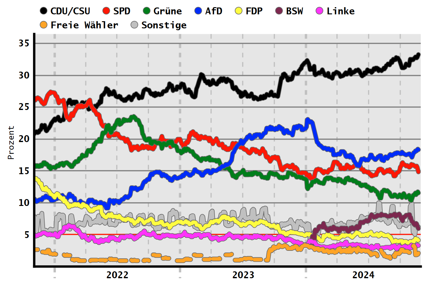 - INSA (BILD), mittlerer Tag der Befragung: 16./17.11.2024, internetbasierte Befragung von 2.008 gezielt ausgewählten Mitgliedern einer Personengruppe (Befragten-Pool),