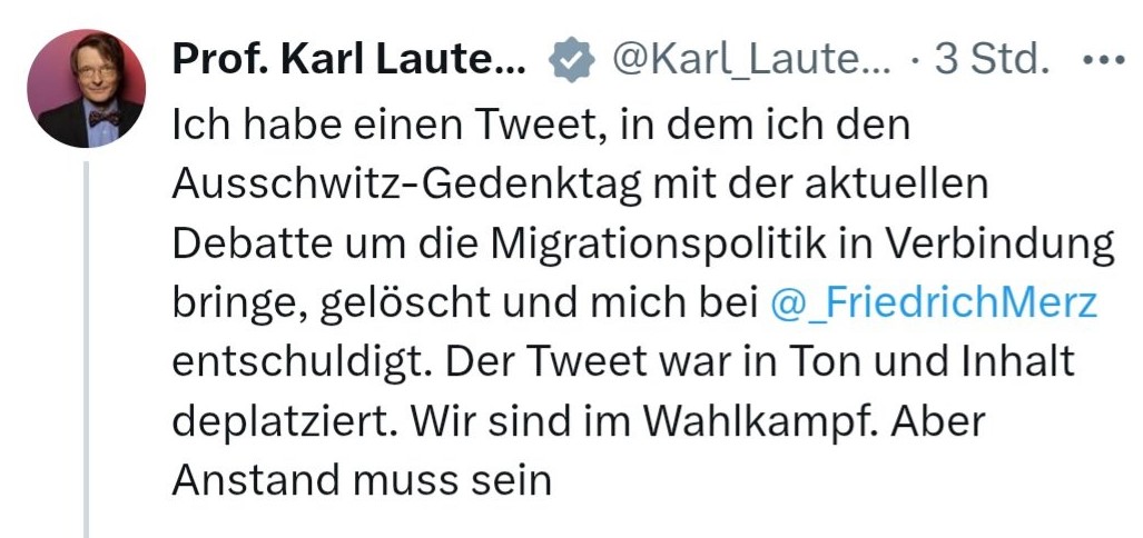 „Wir schließen uns der breiten Kritik an den Aussagen von Karl Lauterbach im abgebildeten Tweet an. Den Shoah-Gedenktag für parteipolitische Anliegen zu verzwecken ist, unabhängig vom jeweiligen Anlass, eine Grenzüberschreitung, die eines Ministers unwürdig ist.“