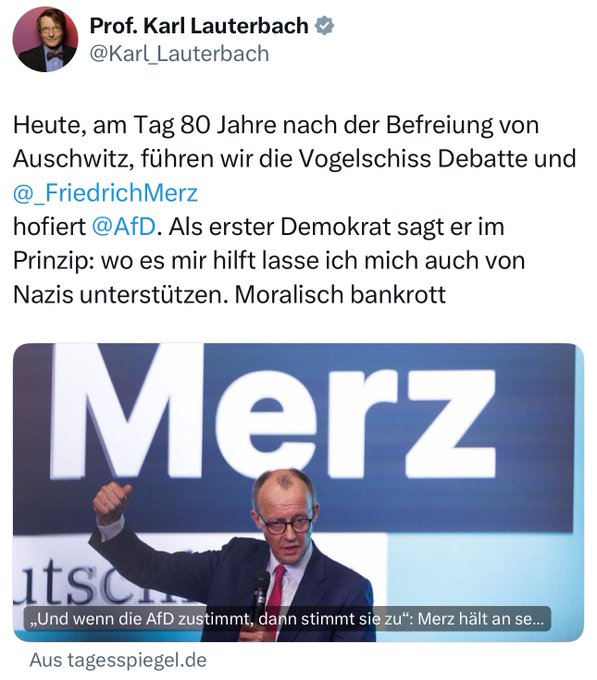 „Heute, am Tag 80 Jahre nach der Befreiung von Auschwitz, führen wir die Vogelschiss-Debatte und Friedrich Merz hofiert AfD. Als erster Demokrat sagt er im Prinzip: wo es mir hilft, lasse ich mich auch von Nazis unterstützen. Moralisch bankrott.“