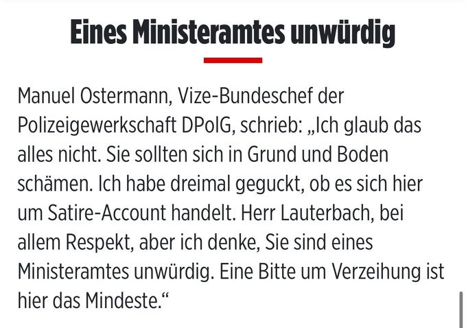 Lauterbach hat sein Posting schnell gelöscht, nachdem sich viele darüber empörten. So schrieb etwa Manuel Ostermann, erster stellvertretender Bundesvorsitzender der DPolG Bundespolizeigewerkschaft und CDU-Politiker mit dem Schwerpunkt Innenpolitik: