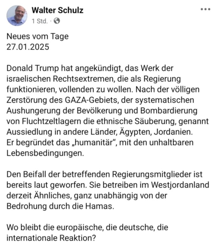 »Die SPD und die Juden. Jetzt schaut Euch mal an, was der Kölner Sozialdemokrat und Fast-Kanzlerbruder Walter Schulz an just diesem Tag, dem Holocaust Remembrance Day, raushaut. Diese Partei ist verseucht.«
