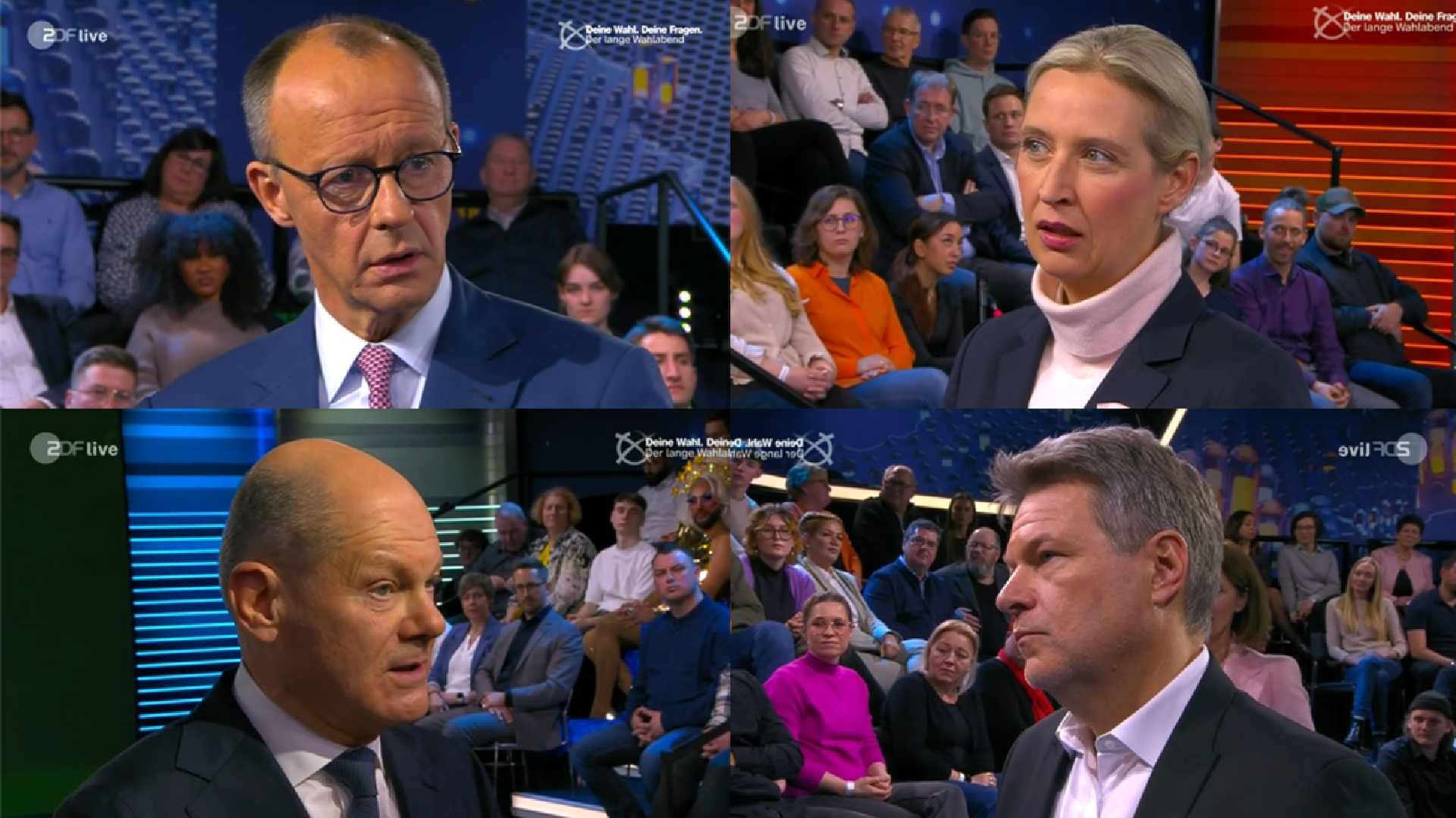 Dann kommt Merz. Was für ein Unterschied zu den drei Vorgängern! Intellektuell, fachlich und charakterlich erstklassig, der Einzige von allen, der wirklich Kanzlerformat hat. (Scholz hätte das intellektuell und fachlich auch, aber charakterlich und politisch so gar nicht.) Und jetzt kommt das eigentlich Überraschende: Merz war bisher bei TV-Auftritten zwar kompetent, sehr oft aber etwas spröde, war kein großer Sympathieträger, versprühte wenig Charme. Vor ein paar Wochen schrieb ich sinngemäß mal Merz sei ein sehr seriöser und kompetenter Politiker und Söder sei ein sehr guter Wahlkämpfer. Merz kann nun plötzlich sogar Wahlkampf. So gelöst, so souverän, so humorvoll, so locker, so einnehmend habe ich ihn selten gesehen. Er kann mit Zuschauern und Bürgern im direkten Dialog richtig gut. Und er bezieht zum Beispiel in der Ukraine-Frage ganz klar Stellung. Ganz wichtig auch, er kann dies auch so begründen, dass Menschen es verstehen können. Welch ein Unterschied zu Scholz!