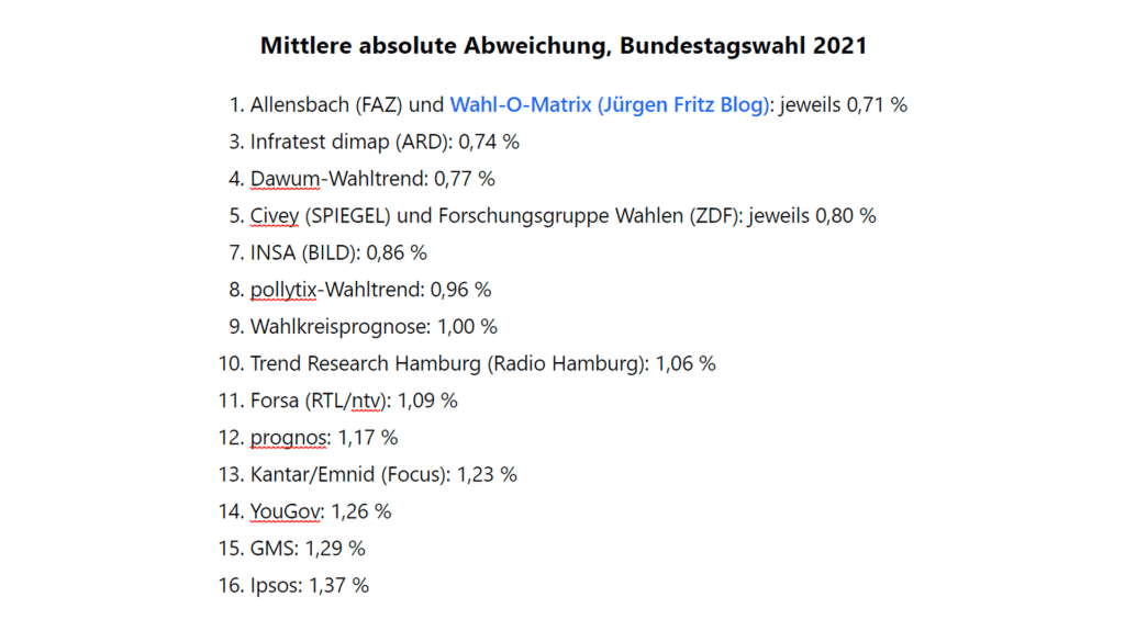 Bei der letzten Bundestagswahl im September 2021 hatte Wahl-O-Matrix mit seiner Prognose mit 0,71 % zusammen mit der letzten Allensbach-Umfrage die geringste mittlere Abweichung vom späteren Wahlergebnis von sämtlichen Umfrageinstituten und Meta-Analyse-Tools. Wer dieses mal am nächsten am Wahlergebnis dranliegen wird, werden wir heute Abend sehen.