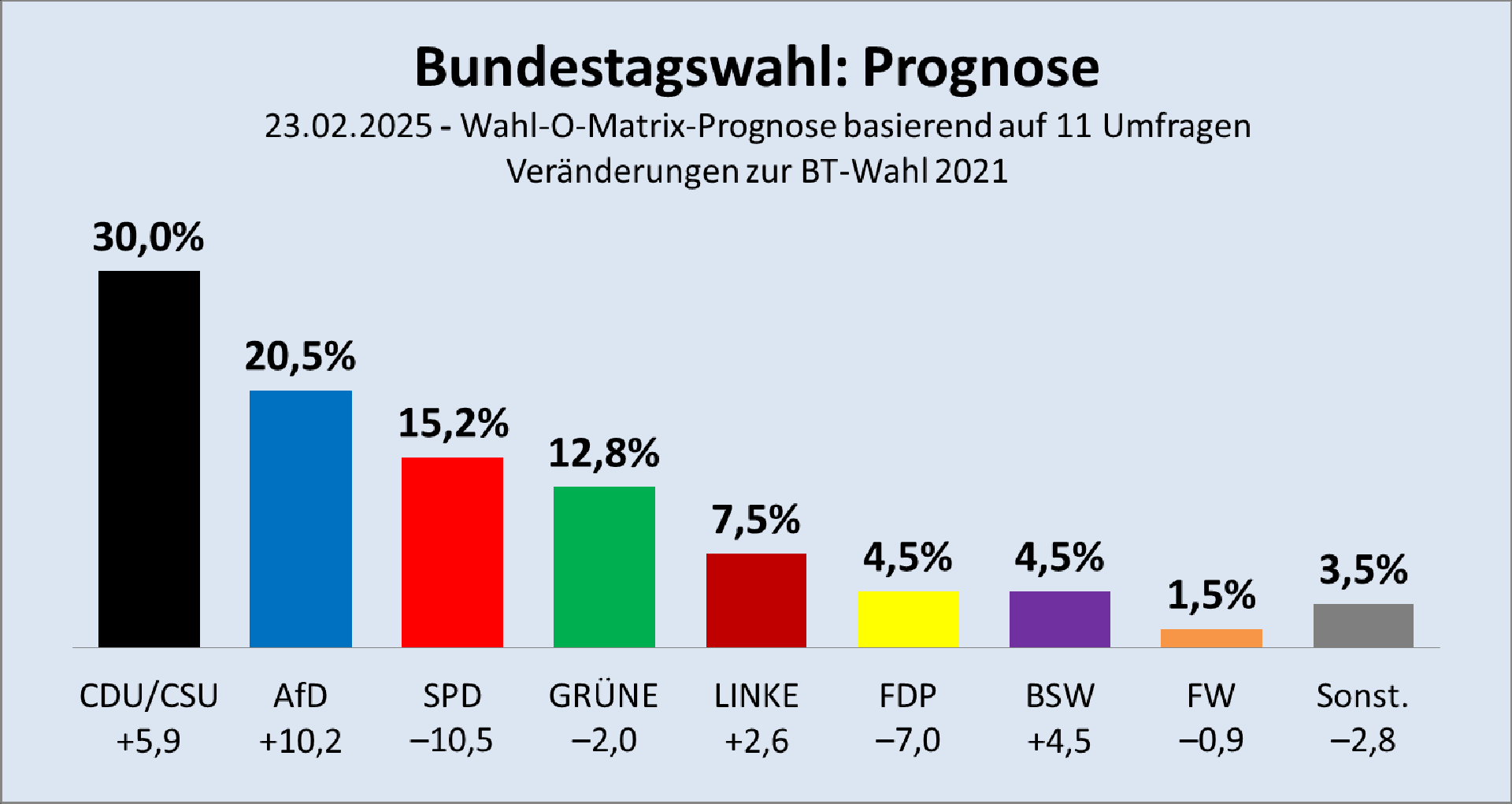 Nachdem die Vertrauensfrage von Bundeskanzler Olaf Scholz (SPD) am 16. Dezember 2024 scheiterte, findet heute die vorgezogene Neuwahl zum 21. Deutschen Bundestag statt. Mindestens 59,2 Millionen Deutsche sind aufgerufen, unser wichtigstes Parlament zu wählen. Hier die Prognose von Wahl-O-Matrix, wie die Wahl ausgehen wird, basierend auf elf Umfragen.