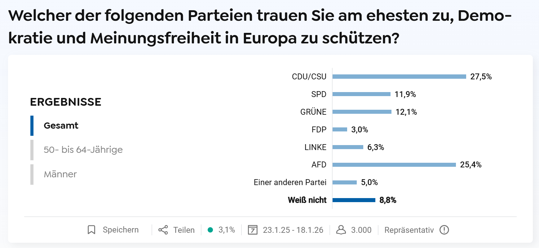 Laut dieser Civey-Umfrage haben die Bürger wohl mehrheitlich inzwischen verstanden, dass von den sozialistischen Parteien, DIE LINKE, DIE GRÜNEN und SPD, am wenigsten Schutz der Demokratie und des Menschenrechts auf freie Meinungsäußerung erwartet werden darf, dass diese vielmehr die größte innere Gefahr für Demokratie und Grundrechte darstellen, Stichwort: zweite Achse des Bösen.