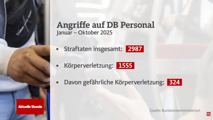 Wie das Bundesinnenministeriums Anfang Januar 2026 auf eine Anfrage des Bundestagsabgeordneten mitteilte, erreichte die Zahl der Gewalttaten gegen Beschäftigte der Deutschen Bahn 2025 ein Rekordhoch. Demnach wurden allein in den ersten zehnt Monaten von Januar bis Oktober 2025 fast 3000 Mitarbeiter körperlich attackiert. Tendenz steigend. Am stärksten betroffen sei der Regionalverkehr. Zu den Angriffen auf DB-Beschäftigte kommen weitere tausende Angriffe und Bedrohungen gegen Beamte der Bundespolizei, die unter anderem für die Sicherheit an Bahnhöfen zuständig sind. Gegen Bundespolizisten wurden dabei 2.981 tätliche Angriffe verübt plus 1.796 Fälle von Bedrohung.