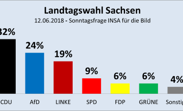 (Jürgen Fritz, 12.06.2018) In den 1990er-Jahren kam die CDU in Sachsen auf Werte von 57, 58 Prozent. Doch inzwischen kommt sie sogar zusammen mit der SPD gerade noch so über 40. Zunächst verlor sie die alleinige absolute Mehrheit, dann 2014 auch die mit der FDP zusammen und jetzt ist sogar die schwarz-rote Regierung meilenweit von einer Mehrheit entfernt. Der große Gewinner ist dagegen die AfD, die immer stärker wird und jetzt schon doppelt so viele Stimmen auf sich ziehen kann wie Grüne und FDP zusammen, fast dreimal so viele wie die SPD.