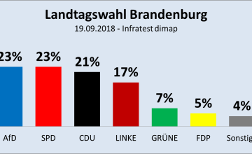 (Jürgen Fritz, 19.09.2018) Fast 20 Prozentpunkte lag die SPD bei der letzten Landtagswahl in Brandenburg vor der AfD. Die CDU hatte beinahe 11 Punkte Vorsprung und Die Linke 6,4. Doch das hat sich inzwischen vollkommen geändert. Im nächsten Jahr sind in Brandenburg wieder Landtagswahlen und die werden völlig andere Ergebnisse zeitigen, wie sich jetzt schon ablesen lässt. In der aktuellen Umfrage von Infratest dimap für RBB, Antenne Brandenburg hat die AfD sowohl Die Linke als auch die CDU bereits überholt und liegt mit der SPD gleichauf auf Platz eins.