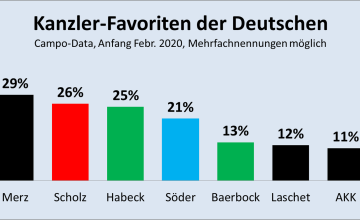 (Jürgen Fritz, 10.02.2020) Annegret Kramp-Karrenbauer hat heute bekanntgegeben, dass sie nicht die Kanzlerkandidatur anstrebe und das Amt als CDU-Vorsitzende spätestens bis zum Sommer abgeben wolle. Damit stellt sich die Frage, mit welchem Spitzenkandidaten die Union in den nächsten Bundestagswahlkampf gehen möchte und wer Angela Merkel im Kanzleramt ablösen soll. Campo-Data hat dazu die Bundesbürger gefragt, wer ihrer Auffassung nach ein guter Merkel-Nachfolger wäre, wen sie mithin wählen würden, wenn der deutsche Bundeskanzler direkt gewählt würde.
