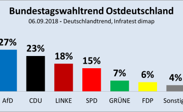 (Jürgen Fritz, 07.09.2018) Die AfD liege im Deutschlandtrend in den ostdeutschen Ländern erstmals vor der CDU, meldet heute die WELT. Nach der Erhebung von Infratest dimap im Auftrag von ARD-Tagesthemen und der WELT komme die Alternative für Deutschland bei der Sonntagsfrage zur Bundestagswahl im Osten auf 27 Prozent, vier Punkte vor der CDU (23), neun Punkte vor der Linkspartei (18). Doch wie verlässlich sind diese Zahlen?