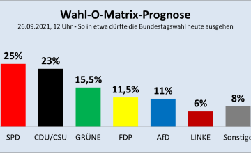 (Jürgen Fritz, 19.09.2021) Die SPD verharrt auf knapp 26 Prozent, CDU/CSU haben ihren Abwärtstrend gestoppt und können minimal zulegen. Die Grünen bleiben 5 bis 6 Punkte hinter der Union und 10 Punkte hinter der SPD abgeschlagen. Die FDP fällt Richtung 11 Prozent, die AfD hält sich recht stabil bei über 11, Die Linke bei über 6 Prozent. Damit gibt es nach heutigem Stand vier mögliche, realistische Regierungskoalitionen.