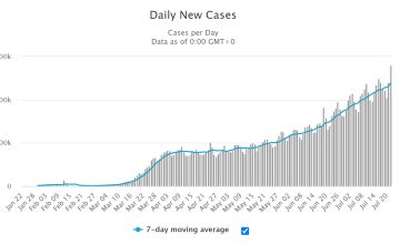 (Jürgen Fritz, 23.07.2020) Eine knappe viertel Million registrierte SARS-CoV-2-Neuinfektionen an einem Tag war der bisherige Rekordwert. Dieser wurde am Mittwoch erstmals übertroffen und zwar weit übertroffen: über 280.000 Infektionen wurden gestern weltweit neu registriert. Und dies war, wie die blaue Sieben-Tages-Durchschnitts-Linie im Bild zeigt, kein einmaliger Ausreißer. Nein, auch der gemittelte Wert geht weiter steil nach oben. Das heißt, jede Woche werden mehr Menschen mit dem neuartigen Coronavirus neu detektiert als in der Woche zuvor. Besonders betroffen derzeit: die USA, Brasilien, Mexiko und Indien. Und in Florida und Texas scheint nun das große Sterben zu beginnen.