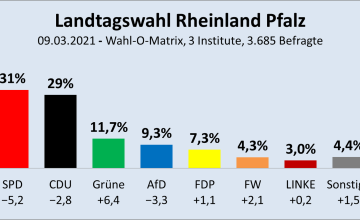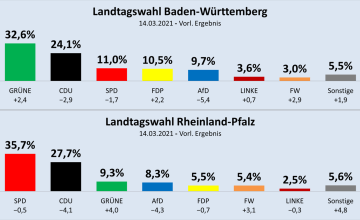 (Jürgen Fritz, 15.03.2021) In Baden-Württemberg triumphiert Winfried Kretschmann (Grüne), in Rheinland-Pfalz Malu Dreyer (SPD). Die CDU fällt dagegen in beiden Landtagswahlen in bislang unvorstellbare Bereiche. Der größte Wahlverlierer ist aber zweimal die AfD, die 35 von 100 ihrer Wähler verliert, in absoluten Zahlen wegen der geringeren Wahlbeteiligung sogar über 40. Die Linke bleibt im Niemandsland, die FDP durchwachsen. Einen Überraschungserfolg erzielen dagegen die Freien Wähler.