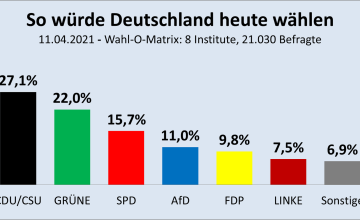 (Jürgen Fritz, 11.04.2021) Ein Viertel ihrer Anhänger hatten CDU/CSU innerhalb von acht Wochen verloren. Doch nun kann die Union sich bei 27 Prozent stabilisieren. Die Grünen bleiben auf ihrem Hoch, die SPD fällt dagegen wieder unter 16 Prozent. Die AfD erreicht ein Zwölf-Monats-Hoch, die FDP sogar ein 40-Monats-Hoch.
