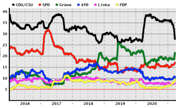 (Jürgen Fritz, 09.05.2021) Vor knapp drei Wochen wurden Annalena Baerbock und Armin Laschet zu Kanzlerkandidaten nominiert. Seither haben sich die Umfragewerte der Grünen und der Union deutlich verändert, wobei die Unterschiede in den letzten sieben Tage etwas zurückgingen. Eine andere Partei befindet sich aber in einer Abwärtsbewegung und erreicht im Wahl-O-Matrix-Mittel aller Institute mit den niedrigsten Wert seit vielen Jahren: DIE LINKE.