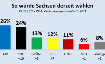 (Jürgen Fritz, 26.05.2021) Bei der Landtagswahl 2019 landete die AfD in Sachsen mit 27,5 Prozent auf Platz zwei, keine fünf Punkte hinter der CDU und war stärker als Linkspartei, Grüne und SPD zusammen. Bei der letzten Umfrage im Dezember, veröffentlicht am 4. Januar, konnte die AfD diese 27,5 Prozent zwar nicht ganz halten, lag aber mit 26 Prozent immer noch auf Platz zwei. Doch seither verlor die CDU zehn Punkte (!) und liegt nun hinter der AfD.