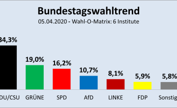 (Jürgen Fritz, 05.04.2020) Vor knapp vier Wochen lagen die Grünen im Wahl-O-Matrix-Mittelwert aller Institute nur vier Punkte hinter CDU/CSU. Vor zehn Monaten waren sie bundesweit sogar mal kurzfristig vor der Union. Doch in den letzten Wochen hat sich das Bild völlig gewandelt. CDU/CSU sind im Moment so stark wie seit zweieinhalb Jahren nicht und streben weiter nach oben, nun Richtung 35 Prozent und darüber hinaus. Die Grünen dagegen fallen erstmals seit der EU-Wahl vor gut zehn Monaten unter 20 Prozent. Und die FDP ist nicht mehr sehr weit von 5 Prozent entfernt. So würden die Deutschen heute wählen.