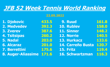 (Jürgen Fritz, 06.06.2022) Djokovic was unable to defend his Roland Garros title. He was eliminated by Nadal in the quarter-finals and drops from 1 to 3 in the JFB Ranking. Medvedev was even eliminated in the round of 16. This means that Zverev, who reached the semi-finals, takes over the top position for the first time and Rafael Nadal moves up from 5 to 4 with his victory, the finalist Ruud from 9 to 5.