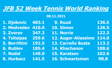 (Jürgen Fritz, 08.11.2021) With his victory at the Paris Masters 1000, Novak Djokovic moves further away from Daniil Medvedev, who was unable to defend his title, in the JFB 52 Week Tennis World Ranking. Paris semi-finalist Hubert Hurkacz moves up to 8, 18-year-old Carlos Alcaraz is in the top 20 for the first time and quarter-finalist Taylor Fritz is the new US No. 1.