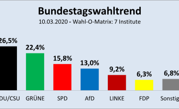 (Jürgen Fritz, 11.03.2020) Bei ca. 6 Prozent scheint sich die FDP nun gefangen zu haben, die nach der Wahl Thomas Kemmerichs zum thüringischen Ministerpräsidenten und seinem Einknicken vor dem Druck der Neuen Linken seit Anfang Februar fast ein Drittel ihrer Anhänger verloren hatte. Umgekehrt scheint die Aufwärtsentwicklung der Linkspartei nach den jüngsten Enthüllungen von ihrer Strategiekonferenz gestoppt und gedreht. Doch wie sieht es bei den anderen Parteien und wie insgesamt aus? Welche Regierungskoalitionen wären im Moment möglich?