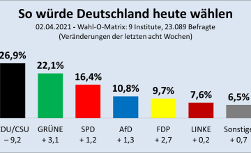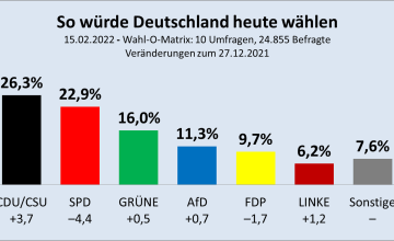 (Jürgen Fritz, 19.01.2025) Nur noch fünf Wochen bis zur Bundestagswahl. In den Wahl-O-Matrix-Mittelwerten aller Institute kann die AfD weiter zulegen und steigt erstmals seit fast einem Jahr wieder über 20 Prozent. DIE LINKE kann leicht zulegen, die SPD fällt dagegen noch weiter zurück. Auch BSW verliert erneut und nähert sich immer mehr der Fünf-Prozent-Marke an.